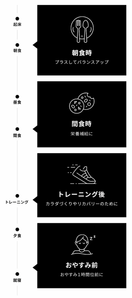 トレーニング実施日だけでなく、トレーニングを実施しない日でも、プロテインを活用して積極的にたんぱく質を摂取するようにしましょう。 - 「プロテイン」は、食品ですので目的に合わせてお好みの量でお飲み下さい。